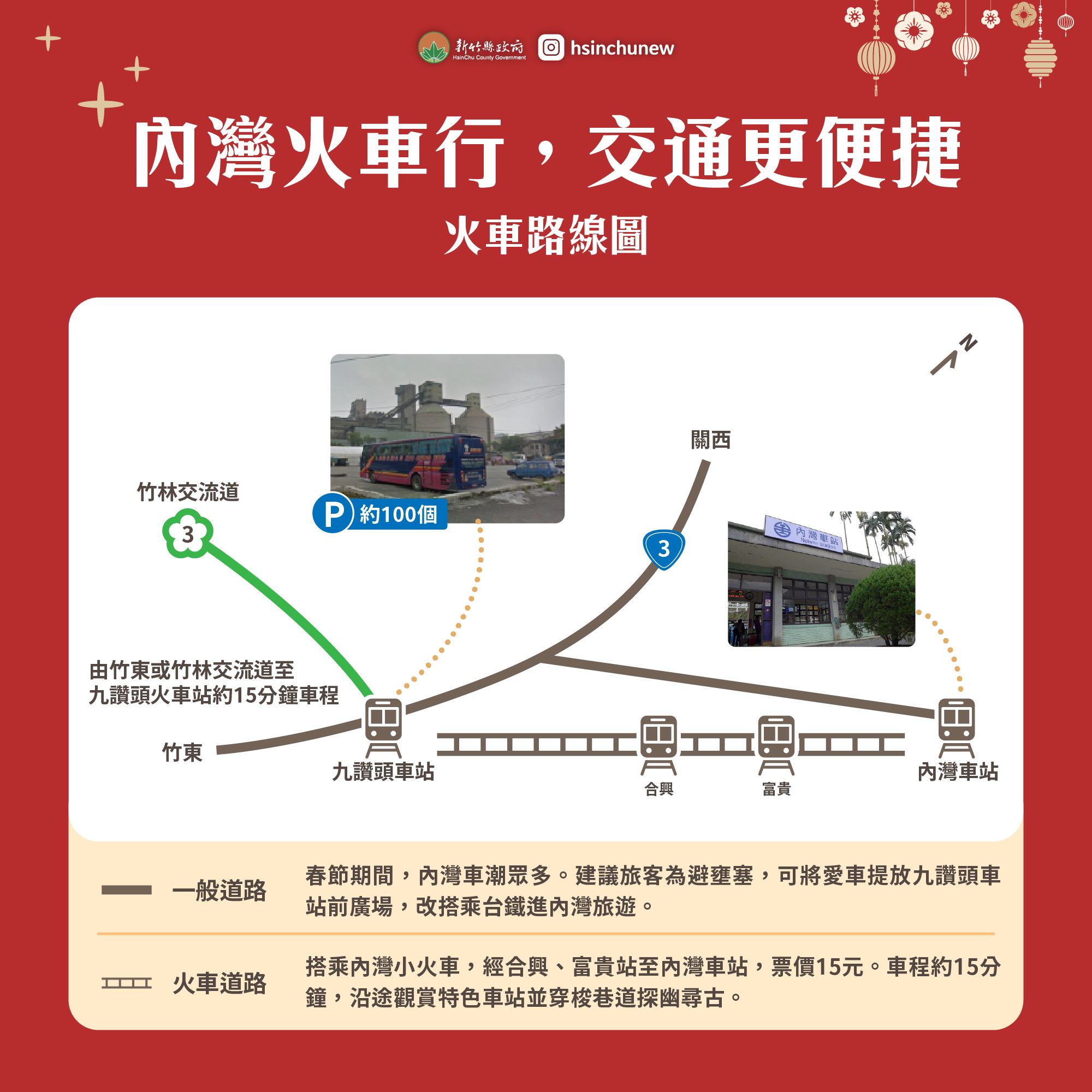 農曆新年即將到來,新竹縣政府彙整春節連假期間各項交通優惠以及各家醫院急門診服務資訊,交通資訊包含觀光景點大眾運輸優惠、春節停車好康、春節計程車費率及熱門風景區替代道路等,民眾可先掌握相關訊息,讓出遊更盡興,如有醫療需求也可多加利用。
