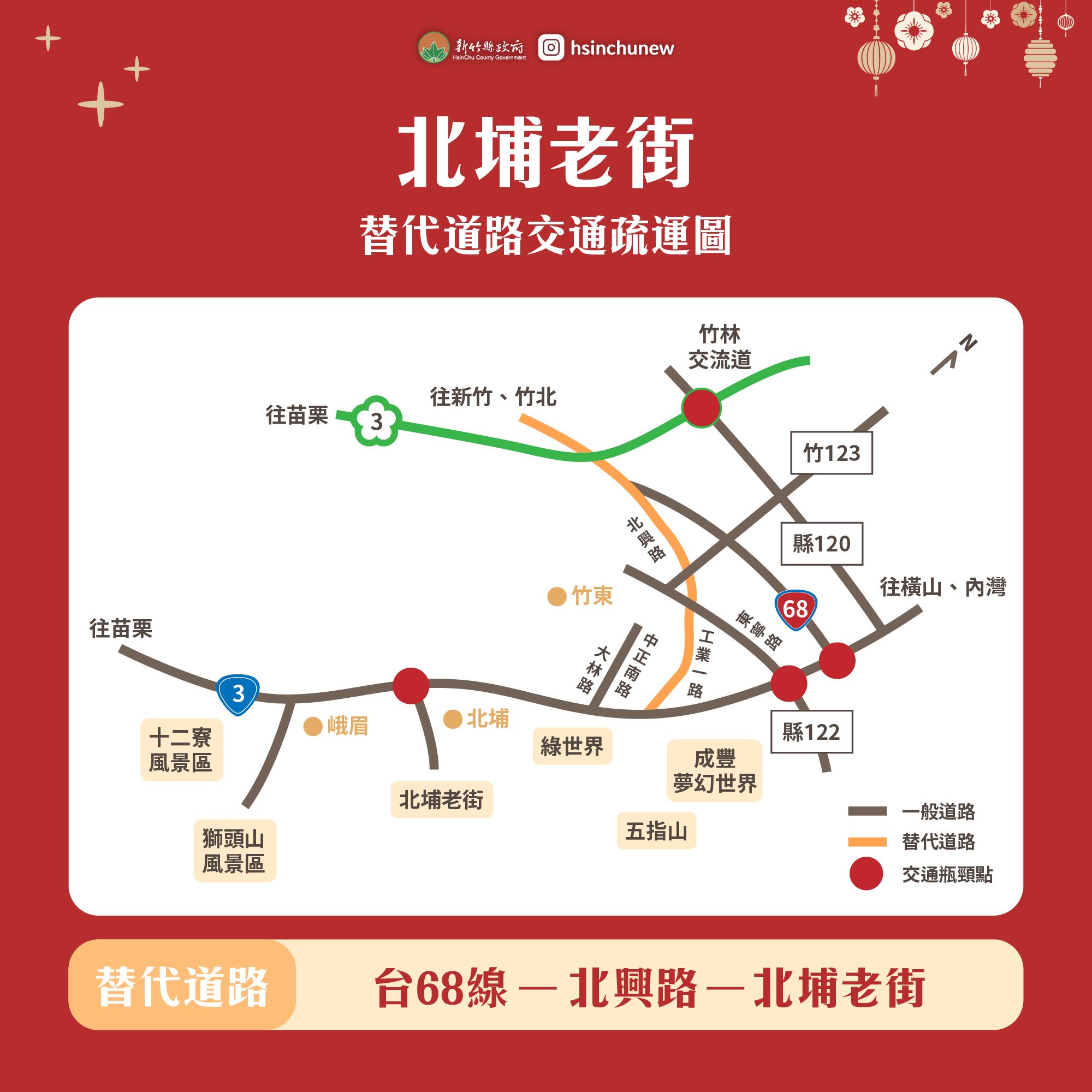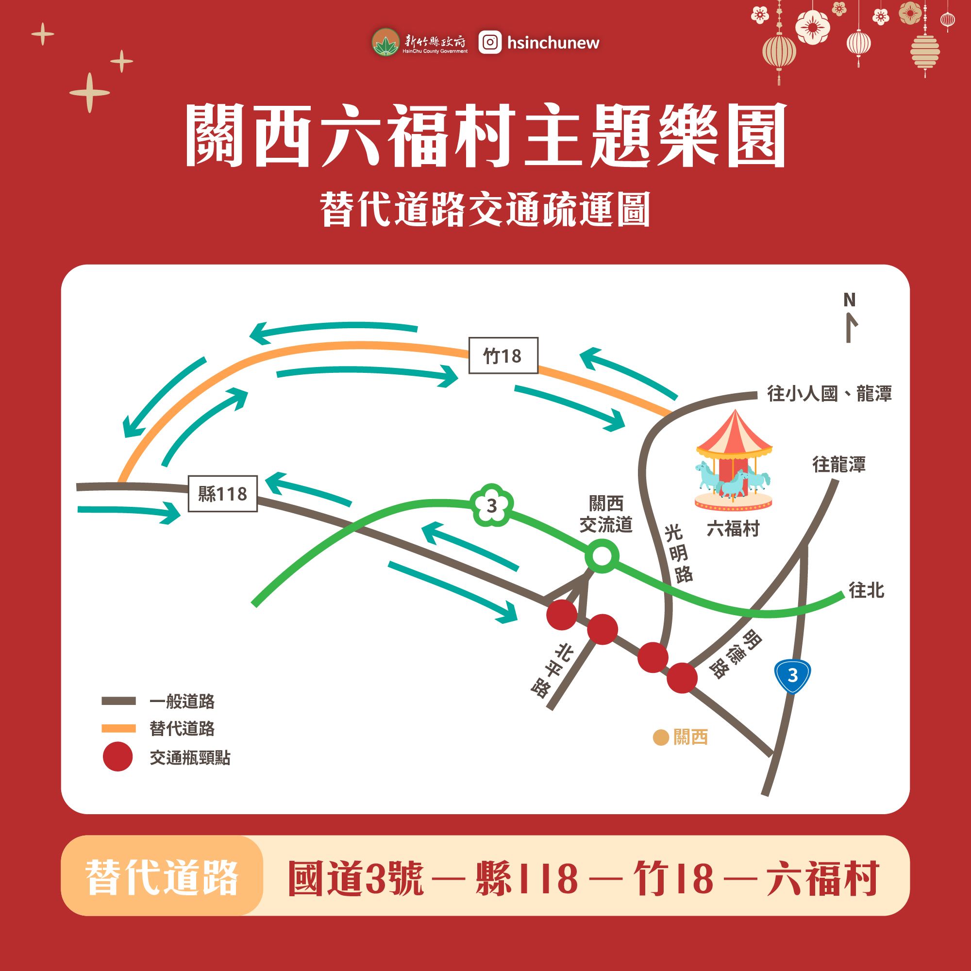 另外,為避免風景區交通壅塞,縣府也規劃替代道路,呼籲開車民眾多利用替代道路,以免壅塞。其中,關西六福村從國道3號走118縣道、竹18線到六福村;北埔老街從台68線轉北興路走台3線到北埔老街。