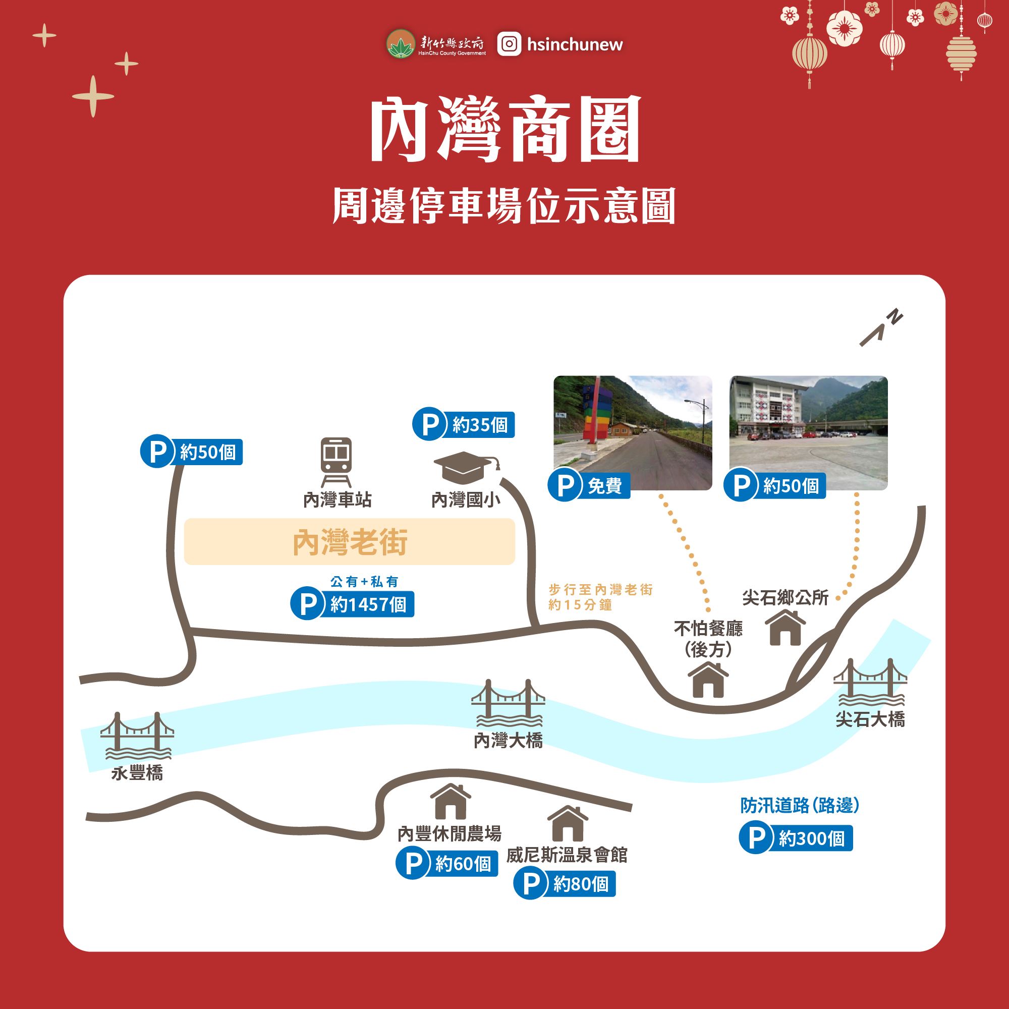 連節期間內灣車潮眾多,民眾可將車停放於距離內灣約1.2公里外的防汛道路,在「不怕餐廳」後方,可免費停放300輛汽車;或將車停放於九讚頭火車站前廣場,再改搭乘內灣線小火車進入內灣老街遊玩。