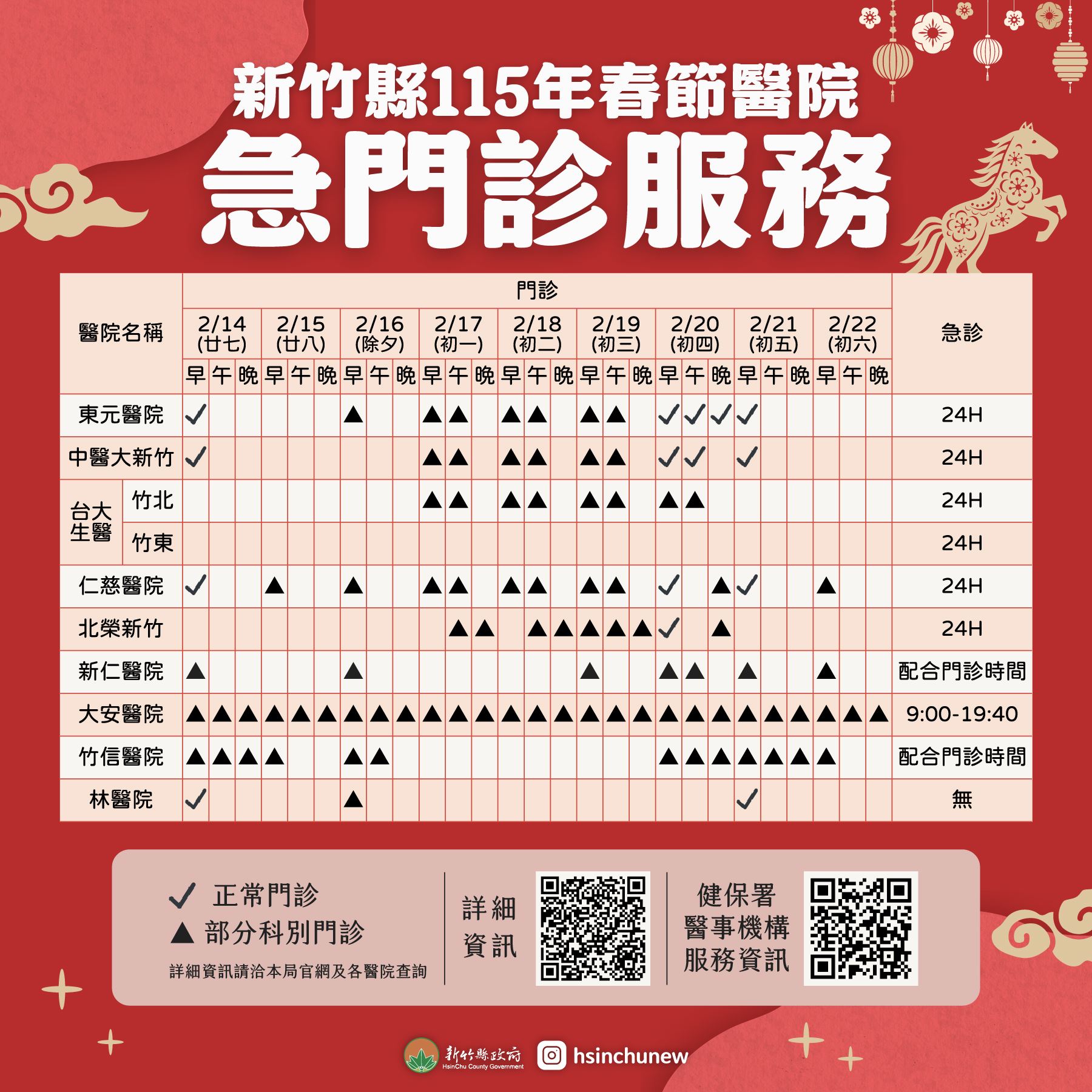 除夕當天除東元醫院、仁慈醫院、新仁醫院、大安醫院、竹信醫院及林醫院開設部分科別門診,其餘醫院則休診;初四及初五兩天僅東元醫院、中醫大新竹附醫、仁慈醫院及台北榮總新竹分院有正常門診,新仁醫院、竹信醫院及大安醫院為部分科別門診。詳細資訊請至衛生局網站查詢https://www.hcshb.gov.tw/News_Content.aspx?n=24&s=108490。